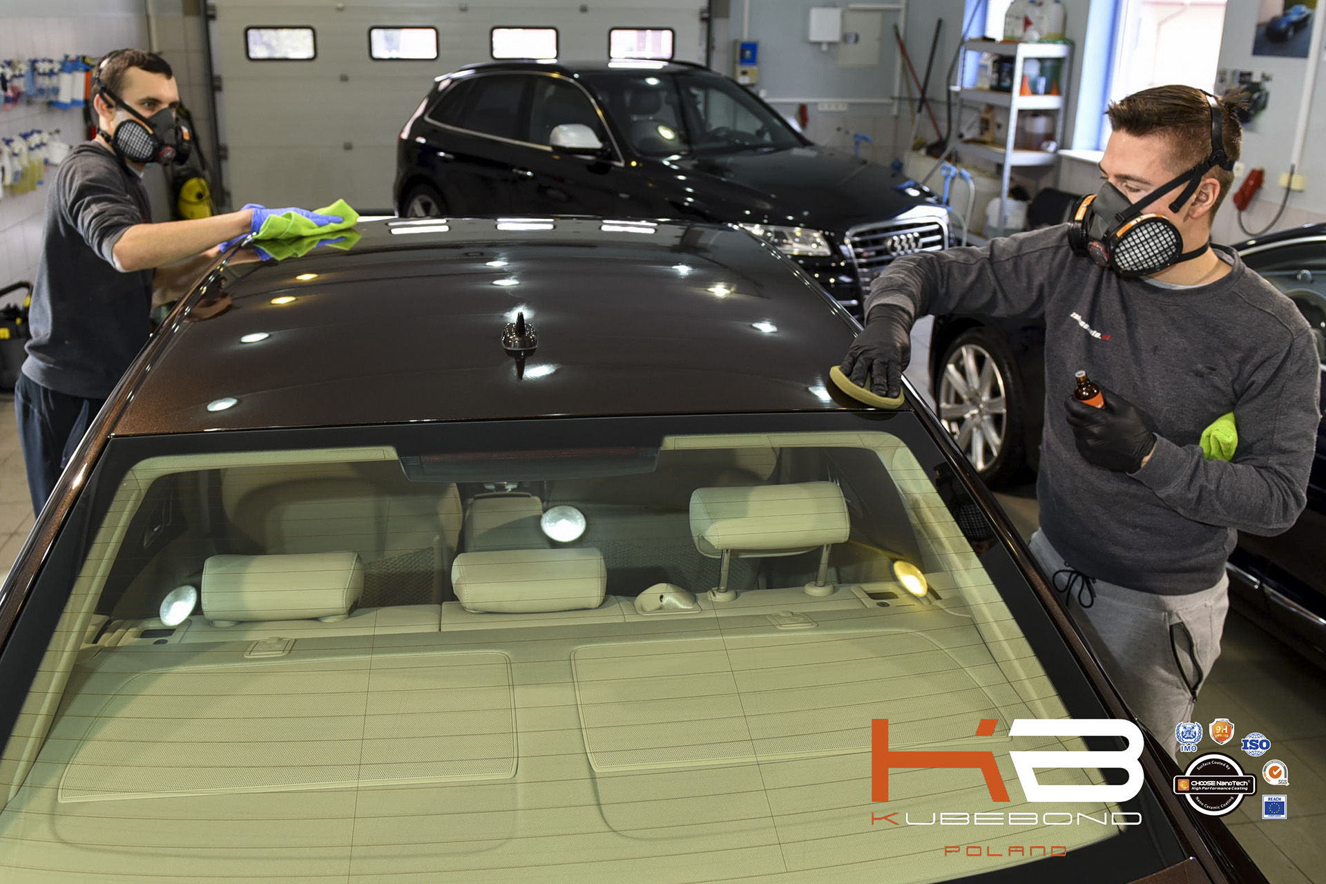 Audi A6 opuściło Salon Sprzedaży pod koniec zeszłego roku, konieczna więc była rewitalizacja powierzchni lakierniczej. Gąbki polerskie Nordic Pad i NanoPolish pozwoliły doprowadzić ją do pierwotnego stanu. Następnie wykonaliśmy aplikację powłoki hybrydowej (Diamnond9H+NanoX). Felgi po demontażu zostały dokładnie oczyszczone i zabezpieczone dedykowanym produktem DuralBond. Za hydrofobizację szyb odpowiadać będzie podczas opadów GlassShield. Całość oczywiście potwierdzono certyfikatem KubeBond NanoCeramic oraz pisemną gwarancją.