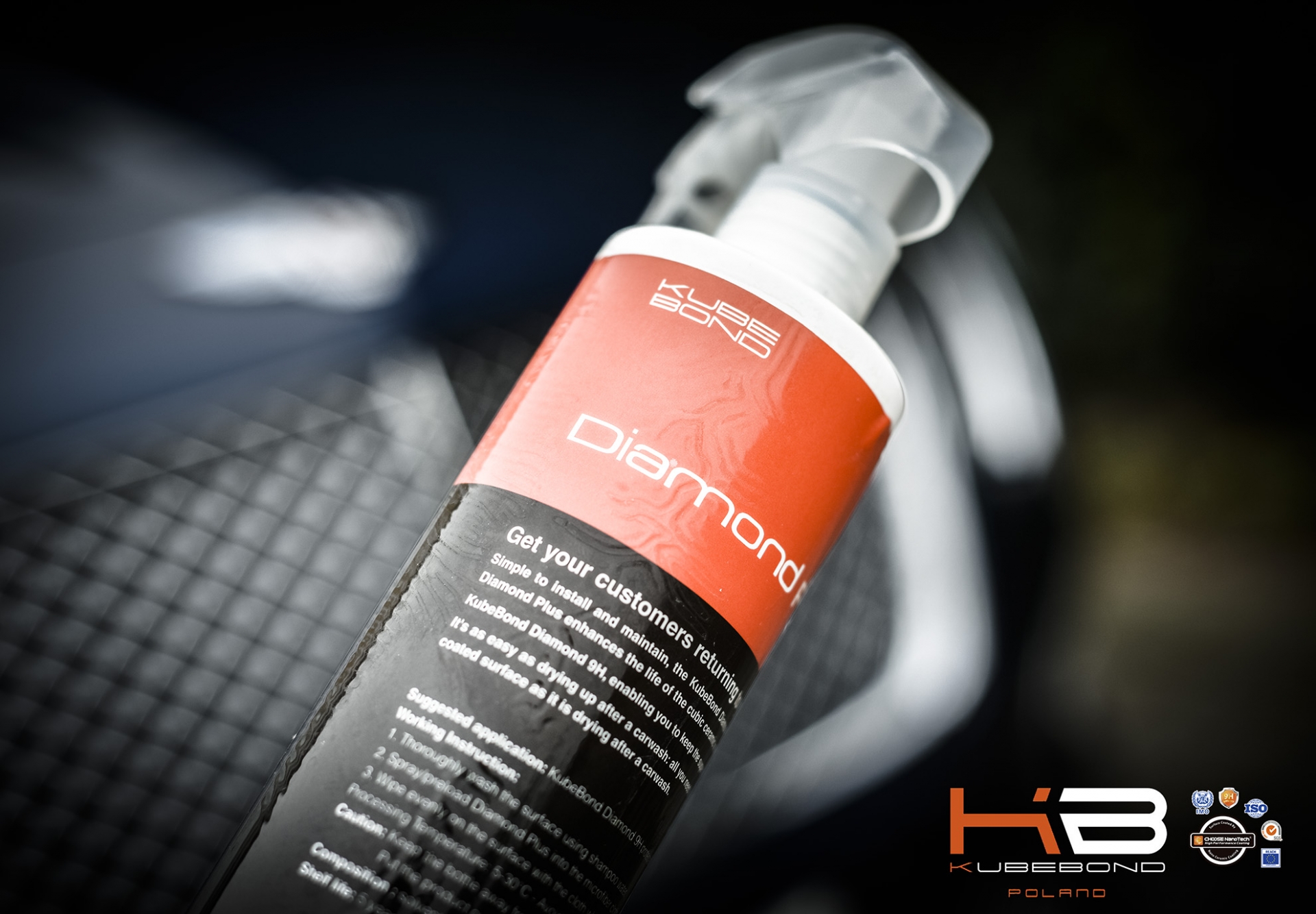 Pojazd po całym roku użytkowania został dokładnie umyty, delikatnie usunięto zabrudzenia ropopochodne oraz organiczne. Następnie po odtłuszczeniu powierzchnię lakierniczą, elementy ozdobne, klosze lamp oraz felgi pokryto powłoką konserwacyjną DIAMOND PLUS. Oprócz widocznego połysku, dużą zaletą tego produktu jest śliskość jaką nadaje powierzchni oraz bardzo duża hydrofobowość. DIAMOND PLUS jest produktem specjalnie opracowanym do bieżącej konserwacji powłok ceramicznych z linii produktowej KubeBond. W przypadku pojazdów, które robią większe przebiegi zaleca się częstsze stosowanie DIAMOND PLUS, co oprócz poprawy efektu wizualnego znacznie ułatwia pielęgnację pojazdu. Wykonanie usługi odnotowano w Karcie Gwarancyjnej, którą wystawiono podczas pokrycia auta powłoką ceramiczną.
