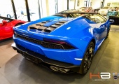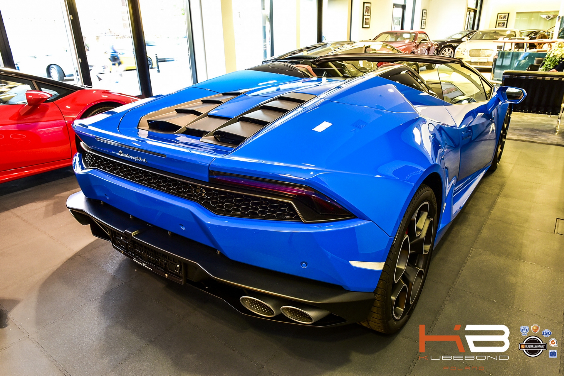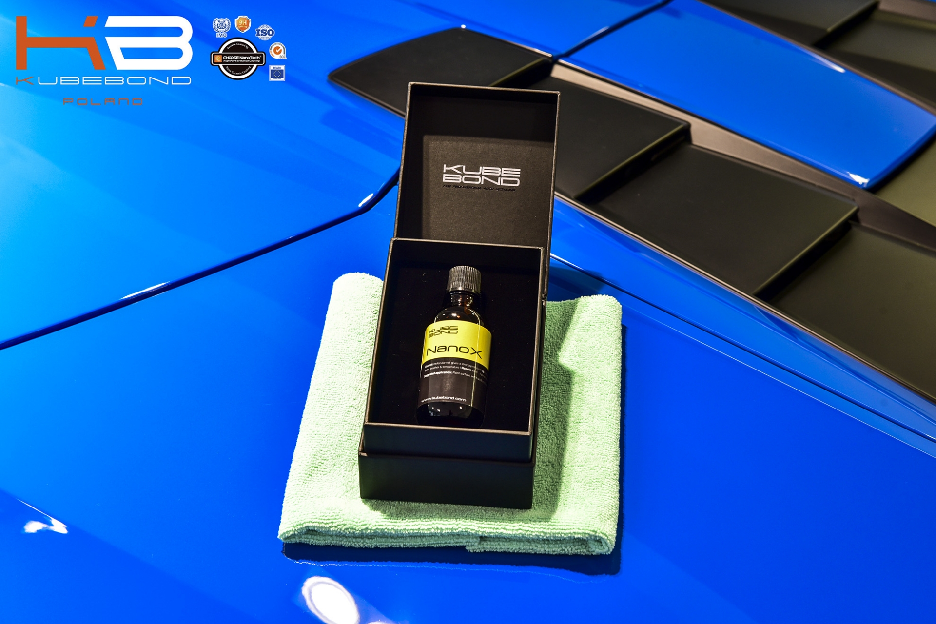 Lamborghini Huracan; zlecenie obejmowało dwuetapową korektę lakieru wykonaną przy użyciu gąbek polerskich Nordic Pads oraz NanoPolish. Następnie powierzchnia lakiernicza została pokryta dwoma warstwami powłoki kwarcowej KubeBond Nano X, co spotęgowało połysk i głębię błękitnego koloru.