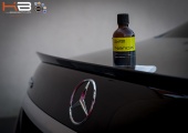 Mercedes E63S AMG opusił jeden z warszawskich Salonów Sprzedaży kilka tygodni temu, więc jego czarny lakier wymagał dwuetapowej rewitalizacji, którą wykonaliśmy gabkami polerskimi Nordic Pad oraz dedykowaną pastą NanoPolish. Po oczyszczeniu i odtłuszczeniu został on zabezpieczony wielowarstwową ceramiczną powłoką hybrydową (Diamnod9H+NanoX), która nie tylko utwardza lakier, ale znacząco zwiększa jego połysk oraz głęnbię koloru. Dodatkowym atutem jest duża hydrofobowość, która zmniejsza podatność na zabrudzenia i ułatwia pielęgnację